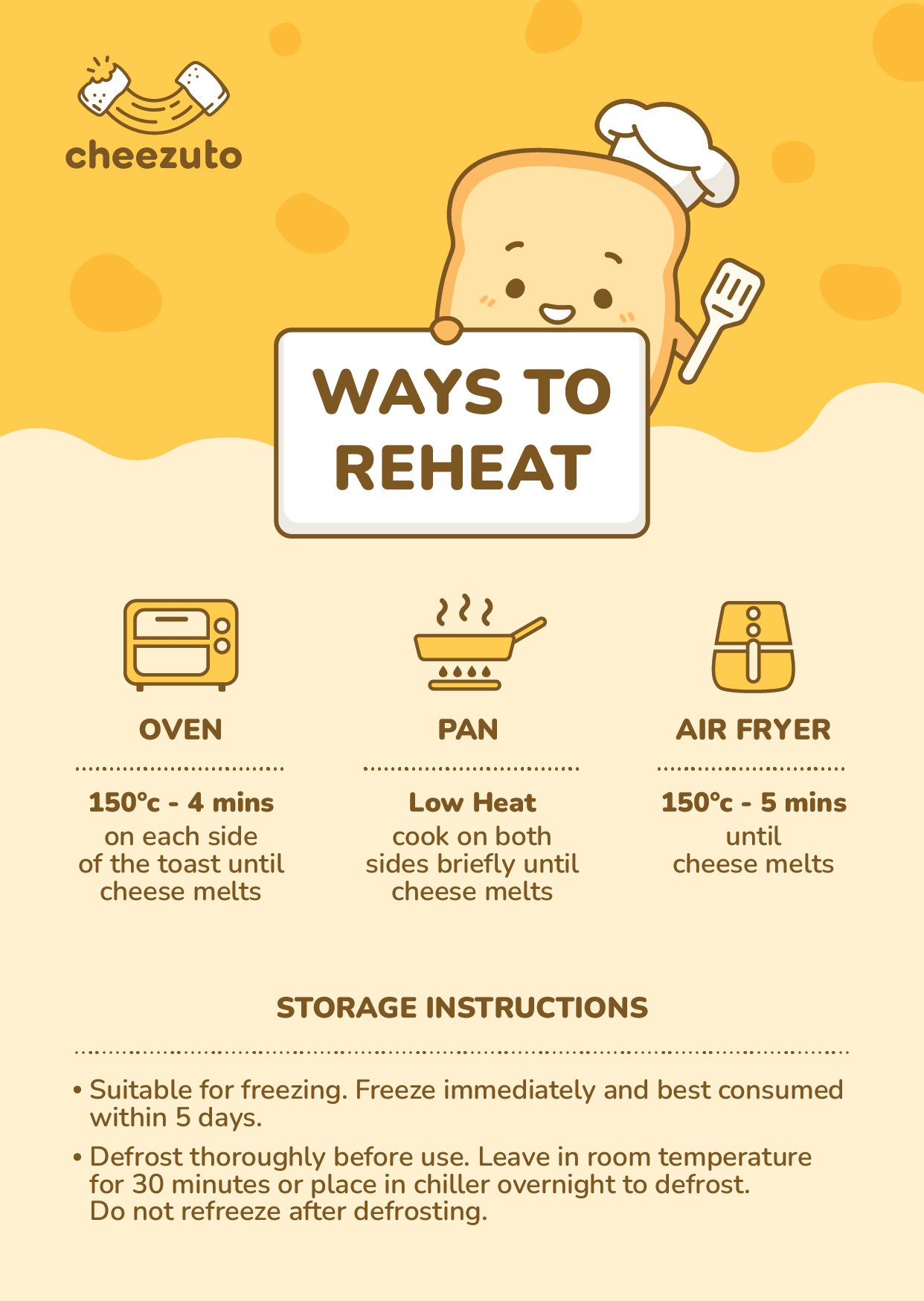 Enjoy our cheese toasts with its signature stretchy cheese at the comfort of your own home or office. Simply reheat and eat! Watch How to Reheat video here